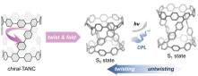 科研人员从定点官能化的环对苯撑出发,通过轴向官能团转化和苯-苯键的共价连接,分别合成了手性-TANC和内消旋-TANC两种异构体。手性-TANC,可视为缺陷石墨烯片段的卷曲对应体,在光激发下可通过桥联苯单元的折叠/解旋,实现构象动态运动,从而产生螺旋手性的动态演化。内消旋-TANC,在结构上对应缺陷联苯网络的卷曲片段,其晶体结构显示桥联苯单元,存在显著的扭曲应变,增强了分子整体构象的刚性。